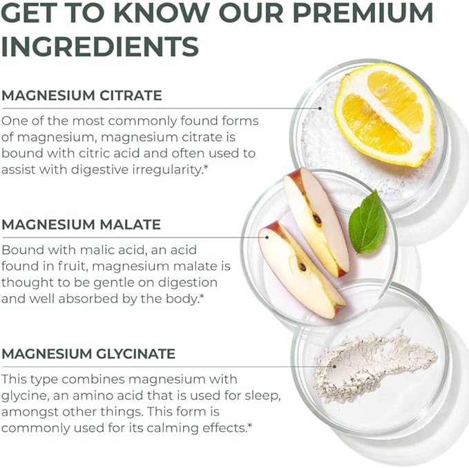 - Glycinate, Citrate, and Malate: Contains magnesium glycinate, magnesium citrate, and magnesium malate for optimal absorption