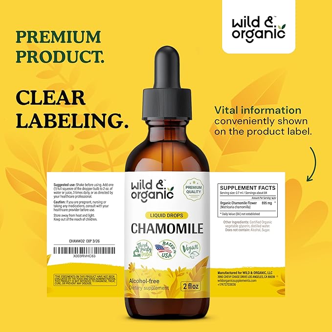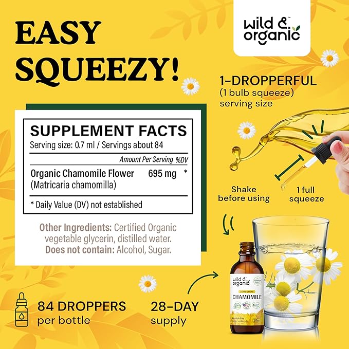 - 28-Day Supply: Each 2 fl. oz. bottle of Wild & Organic chamomile extract liquid drops contains 84 servings per bottle, providing a 28-day supply when taken three times per day.