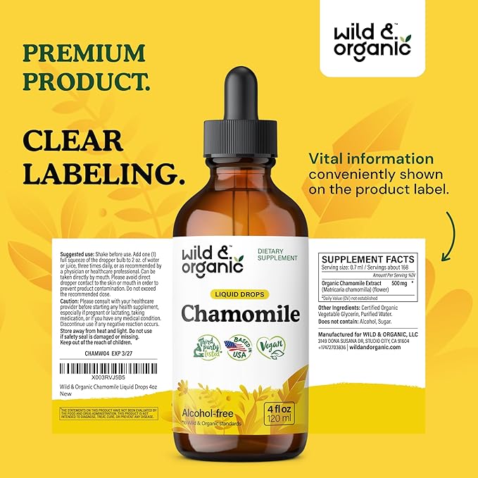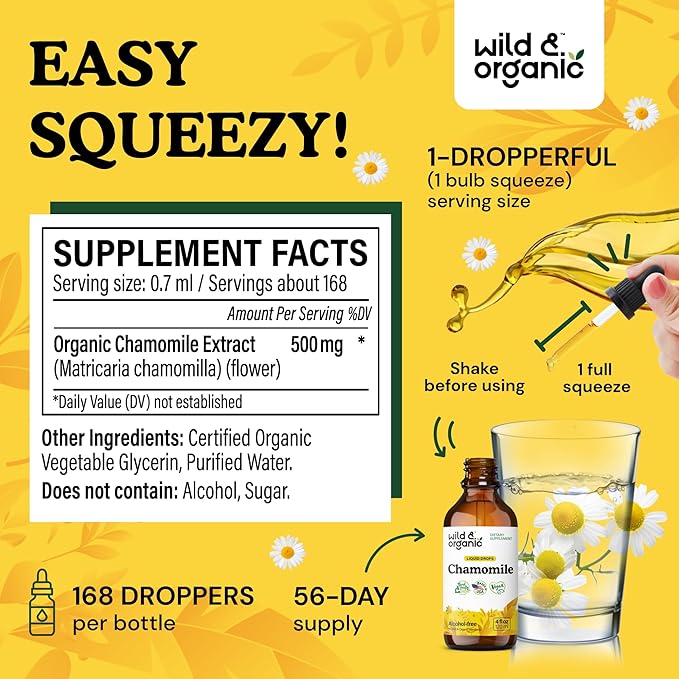- 56-Day Supply: Each 4 fl. oz. bottle of Wild & Organic chamomile extract liquid drops contains 168 servings per bottle, providing a 56-day supply when taken three times per day.