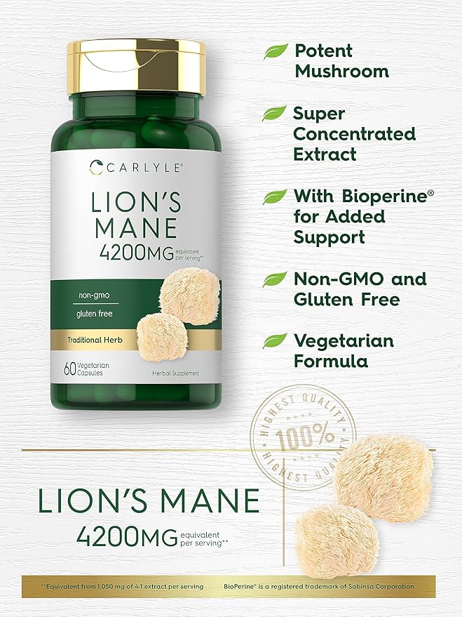 Carlyle Lions Mane Supplement Capsules | 4200mg | 60 Count | Vegetarian, Non-GMO & Gluten Free
