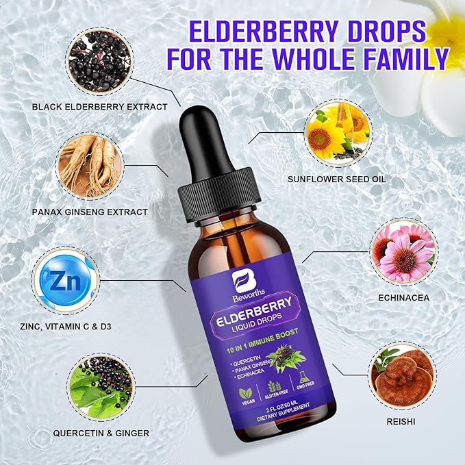 - 【10 IN 1 POWERFUL SUPPORT】- Our premium black elderberry extract for traditional support. Organic Black sambucus elderberry drops syrup blend contains these essential ingredients plus zinc and vitamin C, vitamin D3, echinacea, quercetin, reishi, ginger, and Panax ginseng extract root. It ia a powerful support supplement. Black Elderberry with zinc and vitamin C for adults & kids can be taken it daily for health benefits.