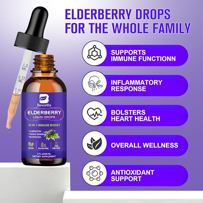 - 【10 IN 1 POWERFUL IMMUNE SUPPORT】- Our premium black elderberry extract for traditional immune support. Organic Black sambucus elderberry drops syrup made with zinc and vitamin C, vitamin D3, echinacea,quercetin,reishi, ginger, and Panax ginseng extract root.It is a powerful immune support supplement.Black elderberry vitamin c and zinc for adults & kids can take it daily for immune health benefits.