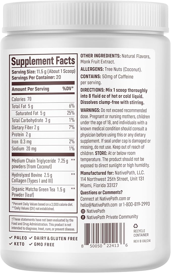 NativePath Collagen Peptides - Hydrolyzed Type 1 & 3 Collagen. Keto & Paleo Grass-Fed Protein Powder for Hair, Skin, Nails, Bones, Joints, Digestion and More - No Gluten or Dairy (Matcha Latte, 230g)