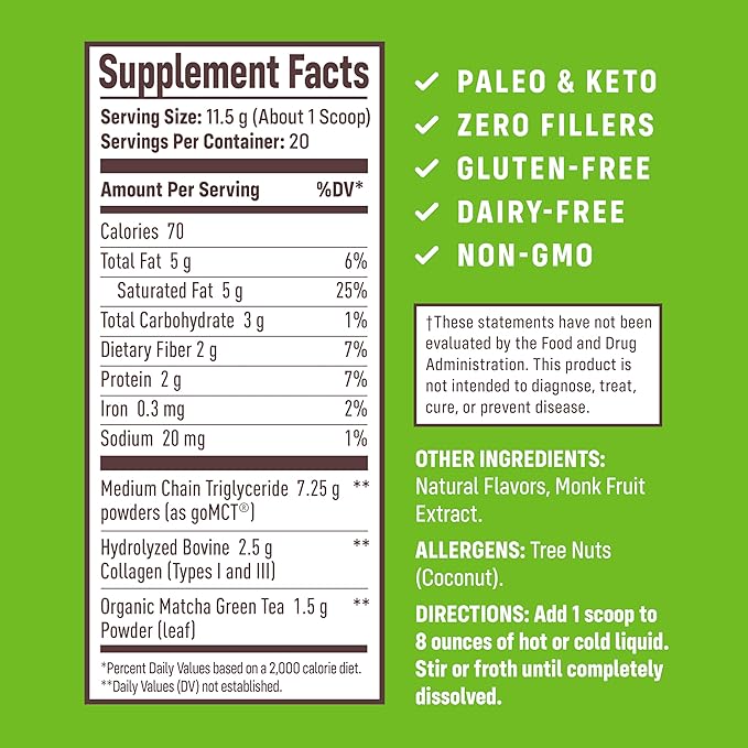- Jitter-Free Energy Boost: Get heightened energy, focus, and clarity without the jitters or crash with our delicious matcha protein powder. Certified grass-fed hydrolyzed collagen powder with 10 grams of Type 1 and Type 3 collagens in each scoop. Plus, optimum blend of caffeine, L-theanine (a calming amino acid), and MCT powder. Contains natural monk fruit and stevia extract sweeteners.