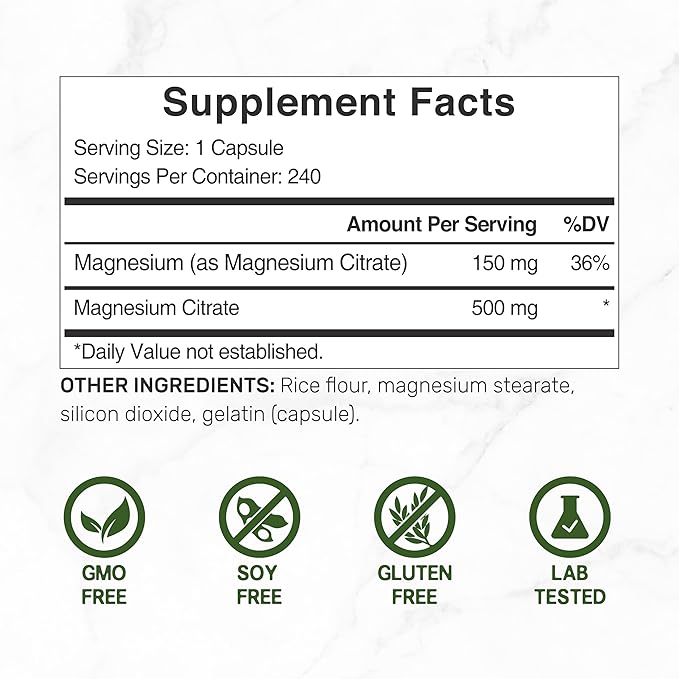 - Dosage & Servings – Once daily single capsule serving to receive 500mg of pure magnesium citrate. Each bottle offers 240 total capsules and up to an 8-month supply (240 servings).