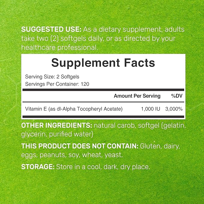 - Dosage & Servings – 240 softgels per bottle with only 2 softgels per serving, supplies 1,000iu of top-grade vitamin E as dl-Alpha Tocopheryl Acetate per dose, lasts up to a 4-month supply.