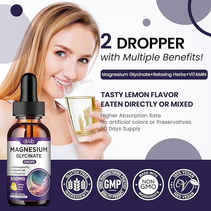 - NATURAL LEMON FLAVOR AND VEGETARIAN: The great tasting liquid magnesium glycinate supplement drops have a yummy lemon flavor that everyone loves. And easier to take: directly into the mouth or placed under the tongue which may have a faster and higher absorption rate compared to capsules, pills, or gummies. It is soy free, non-GMO, gluten-free, dairy-free, and vegan-friendly which is more suitable for all men's and women's dietary needs