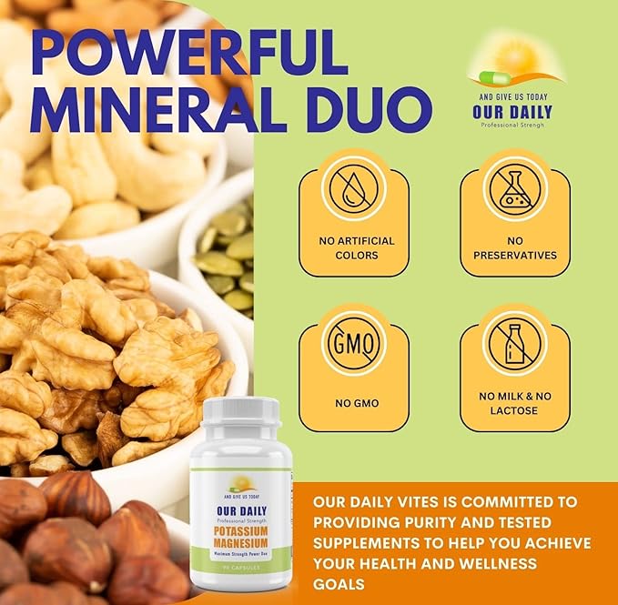 - High Absorption Formula: Our Daily Vites Magnesium Potassium Complex is specially formulated to ensure optimal absorption. This dietary supplement is designed to support vascular health and may help alleviate leg cramps. It provides the recommended daily dose of these essential minerals in a convenient 90-capsule pack.