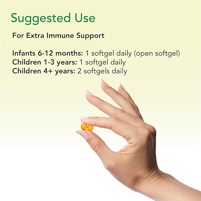 - Daily Dosage for Optimal Health - Infants 6-12 months: 1 softgeldaily (open softgel). Children 1-3: 1 softgel daily. Children 4+: 2 softgels daily