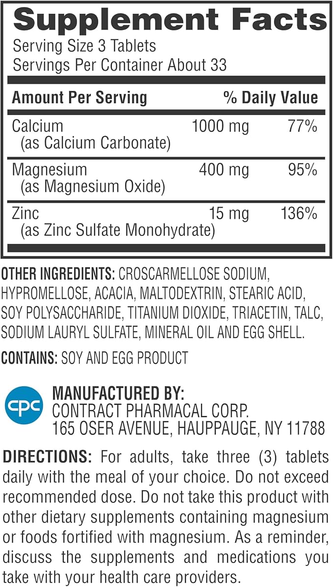 Earth's Splendor 1000 mg Calcium, 400 mg Magnesium, and 15 mg Zinc, Heart and Immune System Health, Bone and Muscle Support Dietary Supplement, 100 Tablets 1 + Month Supply