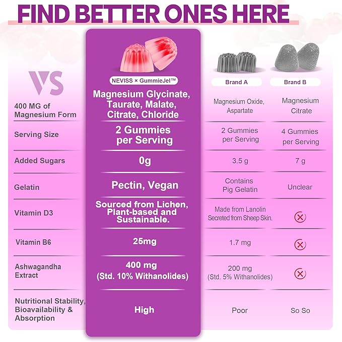- FULL-SPECTRUM MAGNESIUM COMPLEX GUMMIES - NEVISS offers a superior magnesium supplement that blends 5 finest forms of magnesium—glycinate, malate, citrate, taurate and chloride—into a potent 400 mg dose. This expertly crafted formula, combined with black pepper extract for enhanced absorption, delivers comprehensive support for essential functions such as muscle relaxation, bone strength, and nerve health. Enjoy all the benefits without the drawbacks of magnesium oxide or laxative effects.