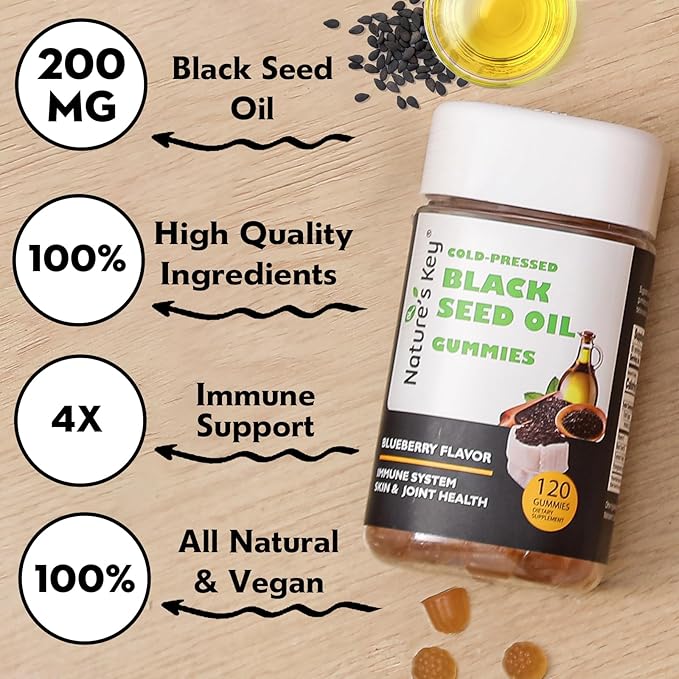 Nature's Key Black Seed Oil Gummies,Support Immunity, Joints, Digestion, Hair & Skin | Cold-Pressed, with 200mg Nigella Sativa Seed Oil, Vitamin C, Ginger, Pomegranate (Blueberry Flavor 120 Count)