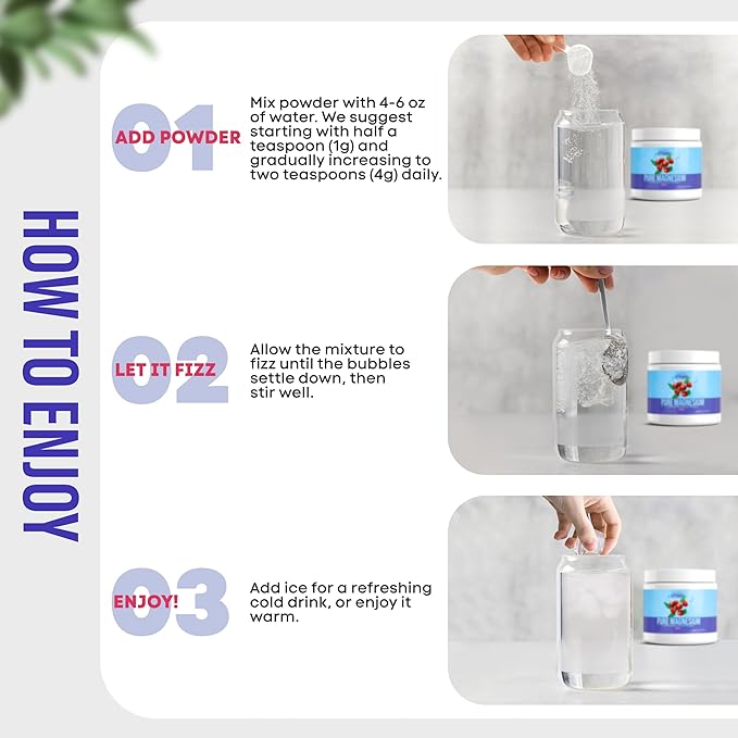 - DAILY SUPPLEMENT FOR ADULTS: We suggest starting with 1/2 teaspoon (1g) daily, gradually increasing to 2 teaspoons (4g) daily. Add 4-6 oz of hot water, let it fiz then stir until dissolved and enjoy. Add cool water if needed.