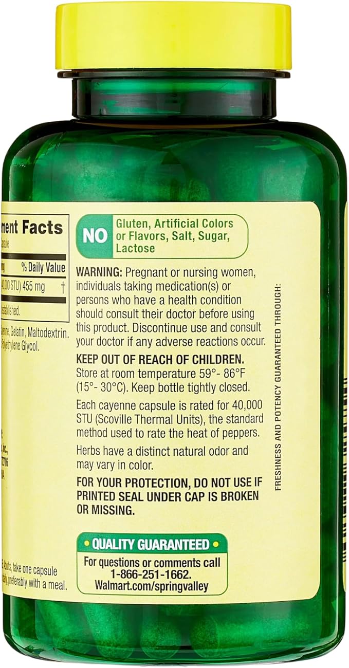 Spring Valley Cayenne Capsules 455 mg (Cayenne Fruit - 40,000 STU), Dietary Supplement, Herbal Support, 100 Count (Pack of 1)