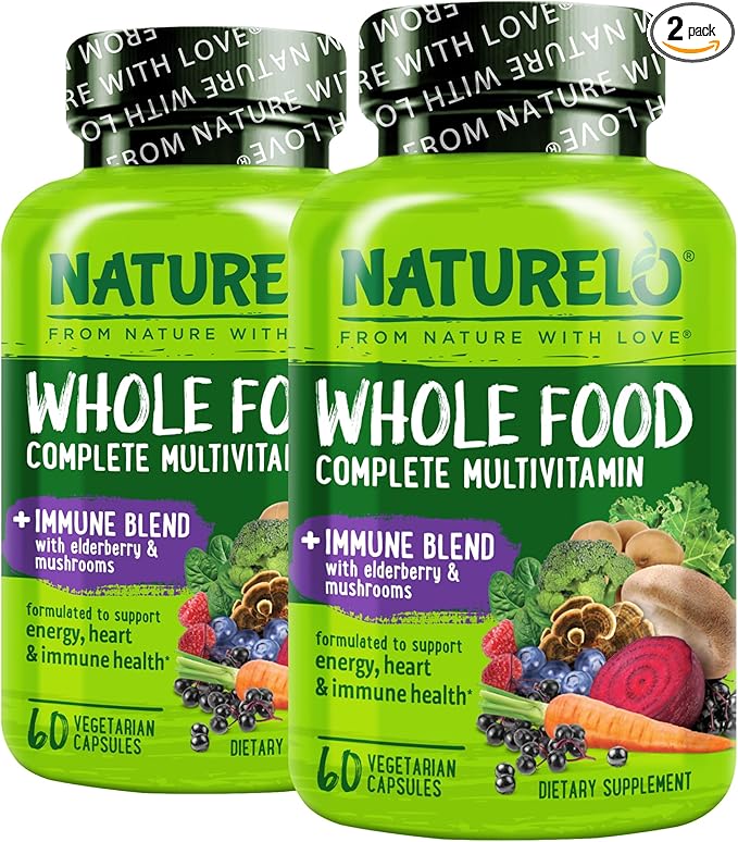 NATURELO Whole Food Multivitamin + Immune Blend with Elderberry & Mushrooms - Complete Multivitamin with Extra Immune Support - C, D3, Zinc, Elderberry, Reishi, Shitake, 60 Vegan Capsules (Pack of 2)