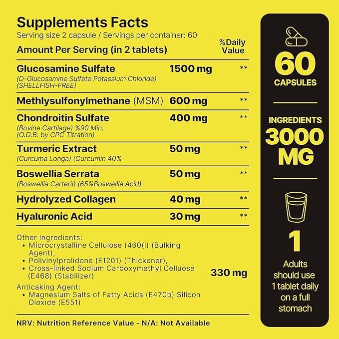 - ADVANCED JOINT SUPPORT: Combines 1500mg Glucosamine, 600mg MSM, 400mg Chondroitin, 50mg Turmeric Extract, 50mg Boswellia Serrata, Collagen, and Hyaluronic Acid for comprehensive joint health.