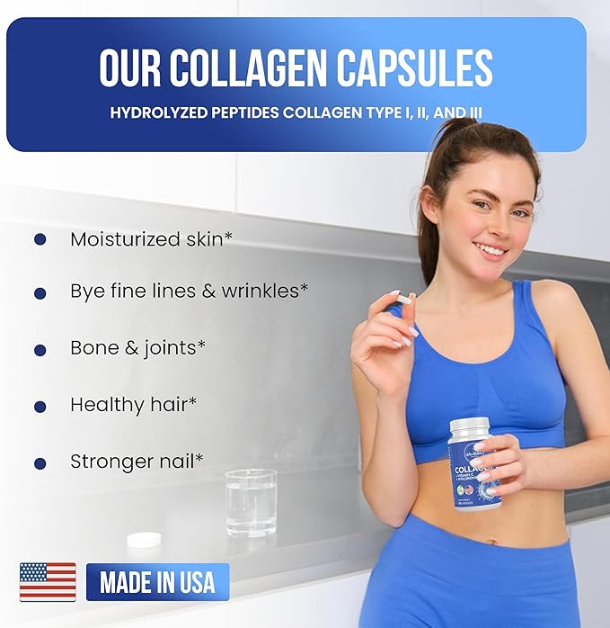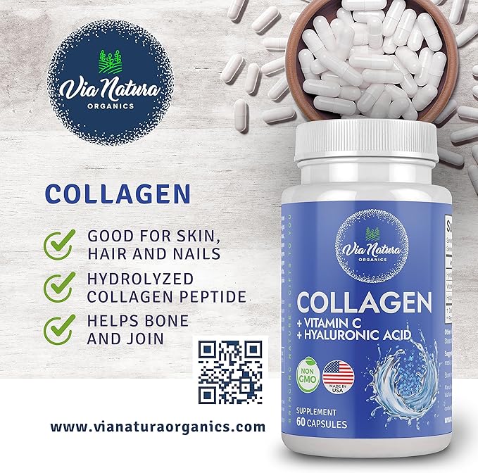 - Hydrolyzed Collagen Peptide + Vitamin C + Hyaluronic Acid. This bottle contains 60 capsules Type I, II and III