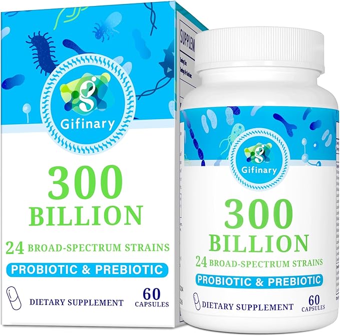 - 300 Billion CFU Daily Probiotic For Your Gut: Gifinary triple strength Once Daily Probiotics for Women and Men, with probiotics + prebiotics + Herbs delivers 300 billion active cultures from 24 Broad-Spectrum Probiotics strains from lactobacillus and bifidobacteria blend which helps maintain cardiovascular function, skin and digestive & gut health. When your gut performs at its peak, your whole body works better