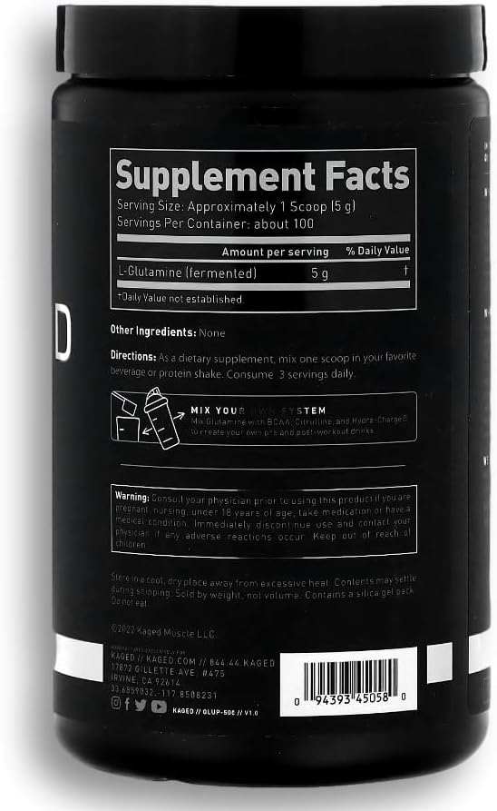 Kaged Muscle, L-Glutamine Powder 500 Gram, Vegan, Support Muscle Recovery, Post Workout, Glutamine, Banned-Substance Free, Unflavored, 100 Servings