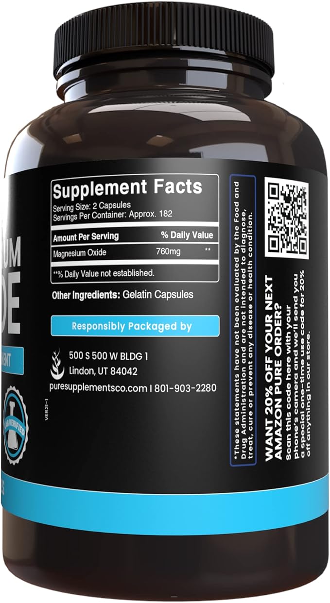 - Magnesium Oxide is a source of elemental magnesium, 180 day supply