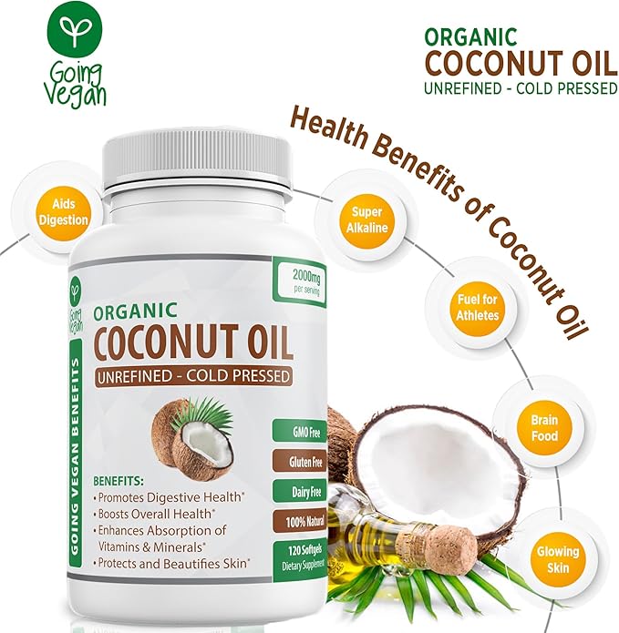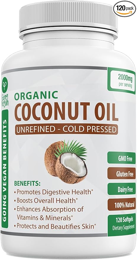 Organic Coconut Oil Capsules 2000mg - 100% Extra Virgin, Cold Pressed for Healthy Skin, Extra Hair Growth, Nail Care, Brain Booster - 120 Softgels - Unrefined Pure & Non GMO Pills - Rich in MCT