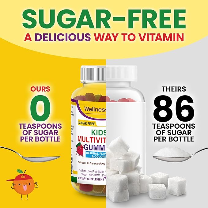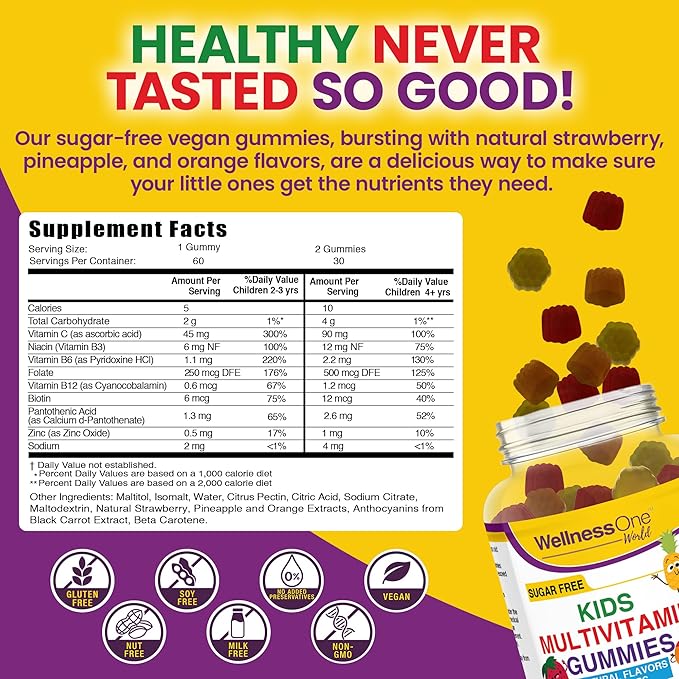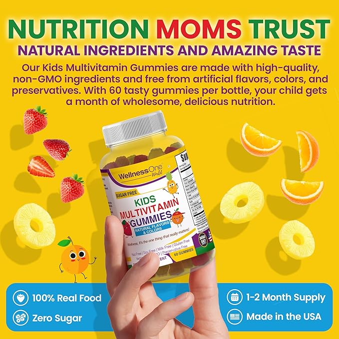 - Yummy, Delicious & Kid-Approved - WellnessOne Kids Multivitamin Gummies are 100% sugar-free, made with high-quality ingredients, and naturally flavored with strawberry, pineapple, and orange – a tasty treat kids of all ages will love!