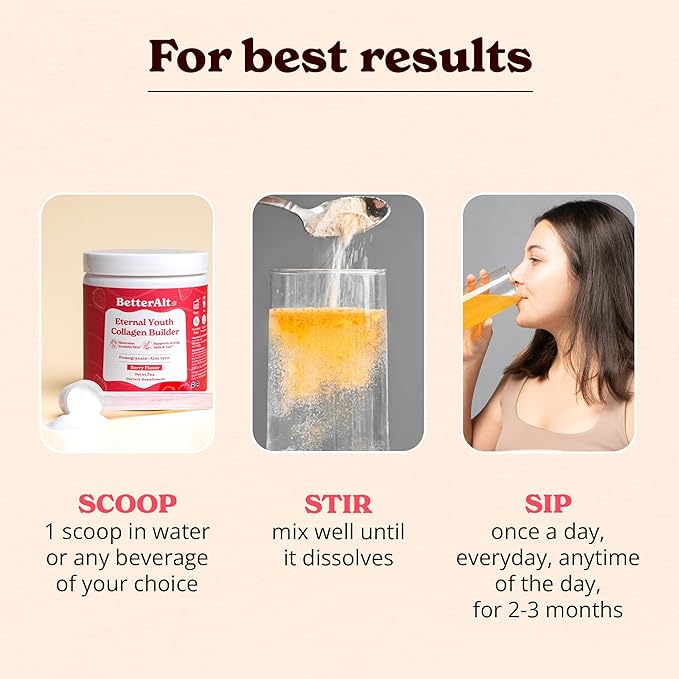- Boosts Collagen Production: Enhances your body's natural collagen production, essential for maintaining skin elasticity, firmness, and supporting joint health.