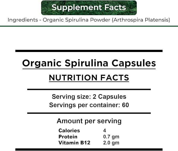 - COMPLETE AMINO ACID PROFILE: Packed with all essential amino acids, our spirulina capsules are an excellent source of plant-based protein, perfect for vegans, vegetarians, and anyone seeking a natural protein boost.