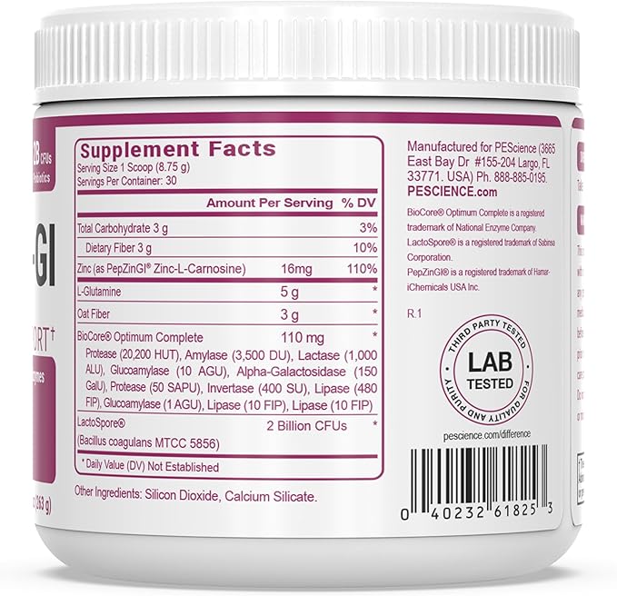 PEScience Complete-GI Gut Health Powder, Unflavored, Probiotics for Women and Men, Digestive Enzymes, Prebiotic Fiber, L Glutamine, Zinc Carnosine, 30 Servings