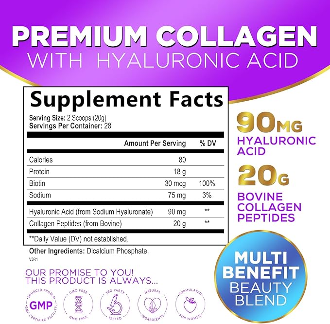 - UNFLAVORED COLLAGEN POWDER: Our Hydrolyzed Collagen Peptides Powder, with Hyaluronic Acid and Biotin, delivers 20g per serving, specifically formulated to support women's hair, nails, skin, and joint health