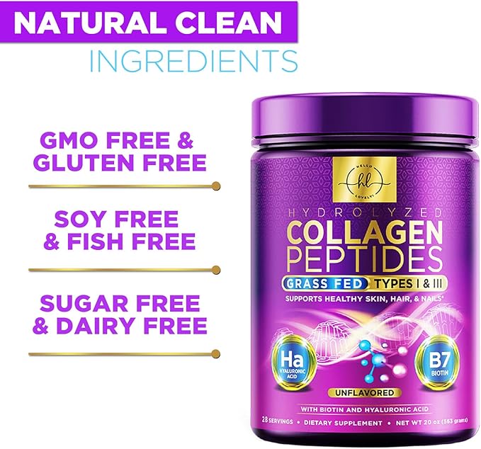 Collagen Peptides Powder - Unflavored Grass Fed Collagen Powder Type I & III Collagen Supplements with Hyaluronic Acid & Biotin - Women's Hair, Nail, Skin, Bones & Joint Health Support - 28 Servings