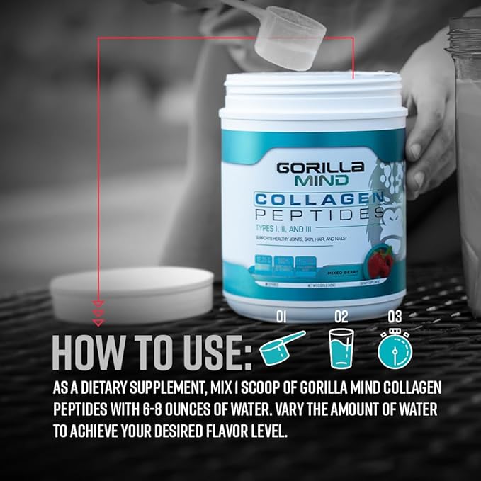 Gorilla Mind Collagen Peptides Powder - Joint & Bone Health/Great for Hair, Skin & Nails/Sleep Support/Types I, II, III/Mix in Water, Juice or a Smoothie - 435g (Blue Raspberry)