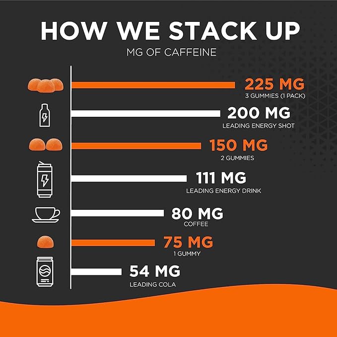 - PERSONALIZE YOUR ENERGY NEEDS: Get full control of your energy! At 75 mg of caffeine per gummy, you decide what you need. Need 75 mg of caffeine for a morning boost? Take 1 gummy. Need even more energy to tackle the day? Take 2 or 3. With 225 mg of caffeine in each pouch you decide.