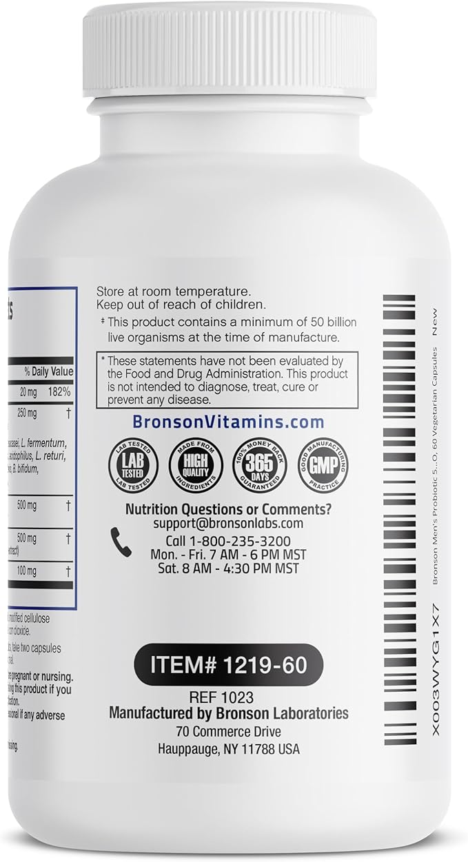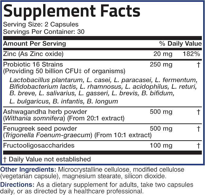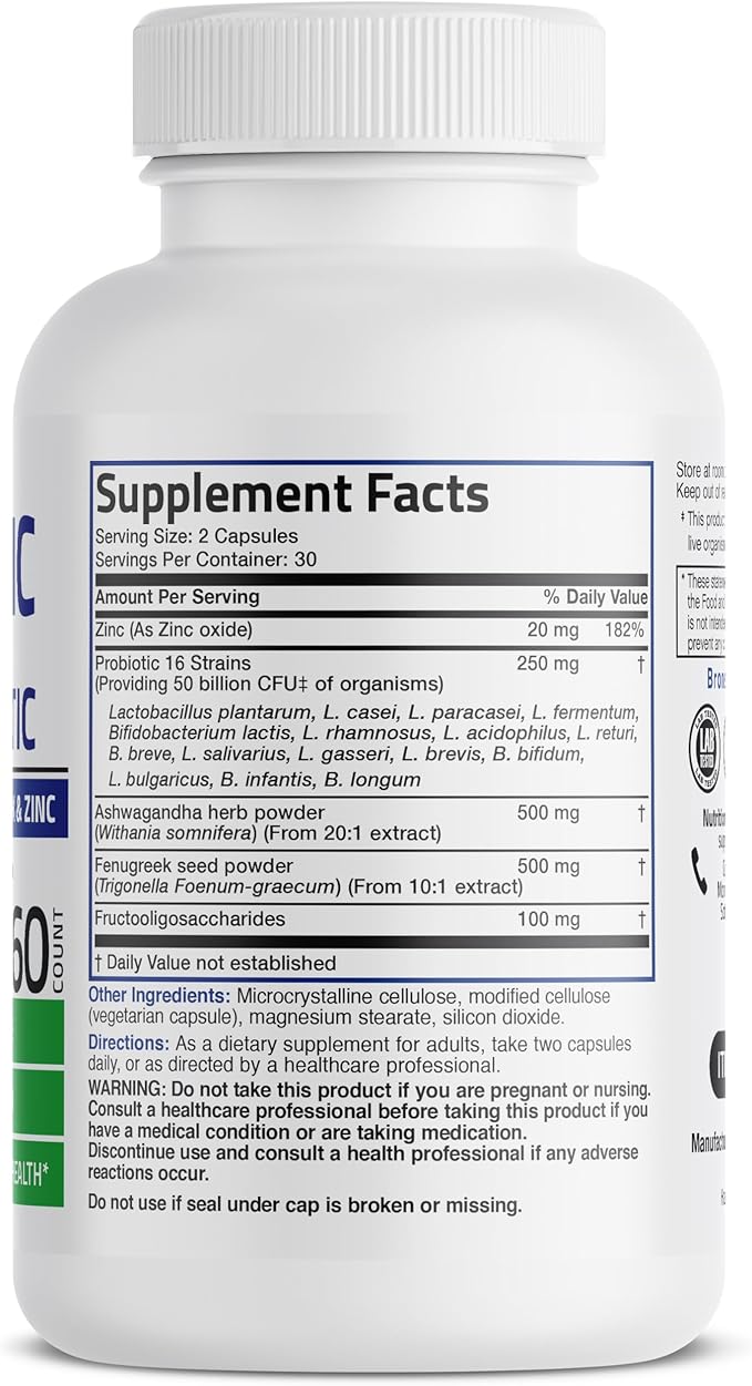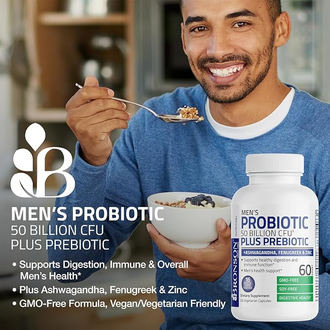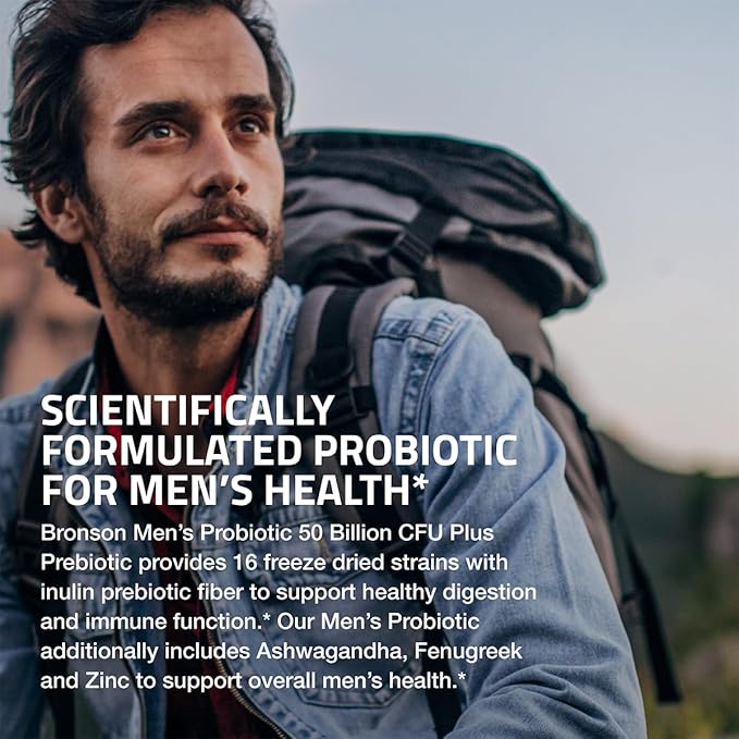 - + Ashwagandha, Fenugreek, Zinc, & Inulin: We aren’t just your average probiotic. Bronson Men's Probiotic additionally provides Ashwagandha, Fenugreek & Zinc to support overall men's health.* Our Men’s Probiotic 50 Billion CFU also includes Inulin Prebiotic Fiber to support the growth of good bacteria.*