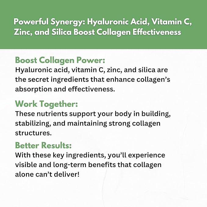 - CONTAINS ESSENTIAL COLLAGEN BOOSTER ✔ Natural Vitamin C is the vital nutrient for the body to use collagen ✔ Silica acts as a "building block" for collagen drink, supporting its effective utilization ✔ Hyaluronic Acid creates a moisture-rich environment that allows collagen peptides to stretch without breaking ✔ Zinc as a "guarantee" that the collagen you take will go to the places where it's needed in your body. They work synergistically to enhance the efficacy of our hydrolyzed collagen powder
