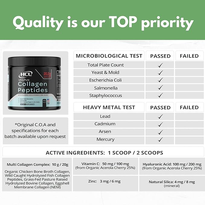 - MULTI COLLAGEN PROTEIN & SUPER HIGH ABSORPTION ✔ HCL Collagen supplements contain a blend of types I, II, III, V, and X . Each type offers unique benefits for your body, working synergistically. Our hydrolyzed collagen peptide undergoes a meticulous process that breaks down the protein into smaller, bioavailable peptides. It ensures maximum absorption and utilization by your body