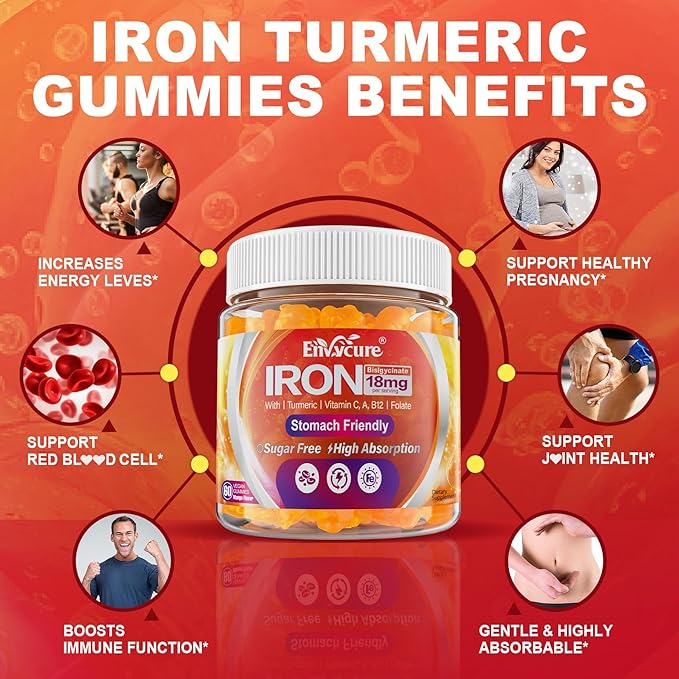 - 👍【Premium Iron Formula for Better Absorption】 Vegan Iron supplements gummies contain highquality iron and 100mg Vitamin C that works with the body to increase iron absorption rates. We also formula Turmeric, Vitamin B12, Folate, Zinc, and Sodium to our iron chewable gummy, which supports iron in promoting the growth of red blood cells, and also help your body increases energy, decreases fatigue & immune system health. Besides, 600mg Turmeric also can suppress stomach cramps, nausea & diarrhea.