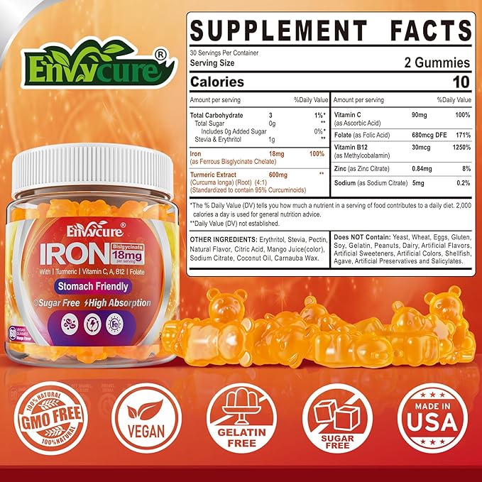 - 💪【Iron Supplement for Those Who Need Iron】 ENVYCURE Yummy iron supplement gummies are a healthy delight for the entire family! Helps you intake enough daily iron and vegan multivitamins to sustain sufficient energy. Designed for individuals with common iron deficiencies such as pregnant women, children, menstruating girls, vegans & vegetarians and anemic men or women.