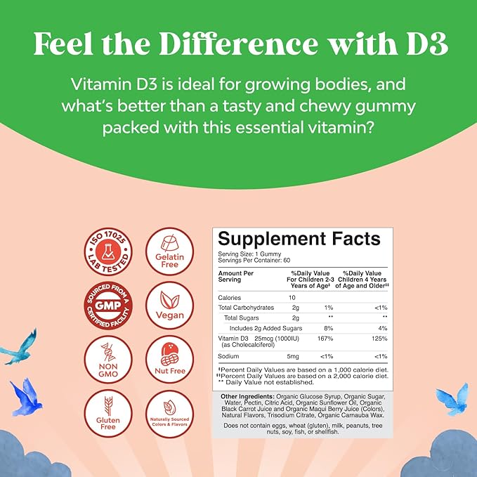 - Organic Wellness - Embrace the supportive power of gummy vitamin D 1000 IU formulated into our vegan and organic base made with vitamin D3 for kids thanks to its higher bioavailability and potency
