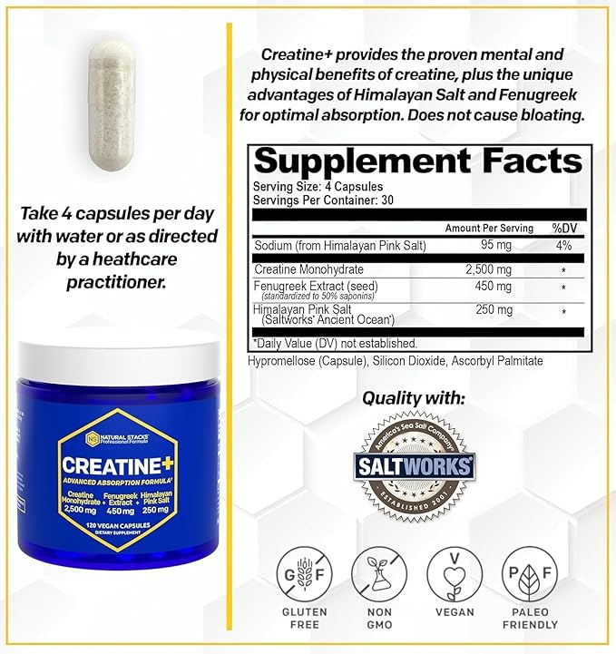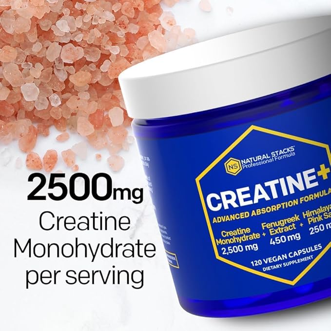 Creatine Monohydrate - 2500mg Creatine Pills - 450mg Fenugreek Extract & 250mg Himalayan Pink Salt - Supports Brain Health, Endurance & Muscle Building - Advanced Absorption Formula - 120 Capsules