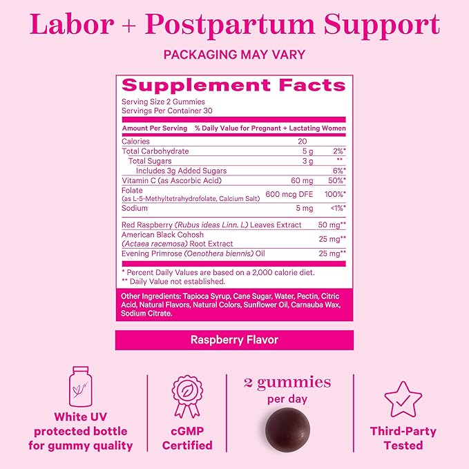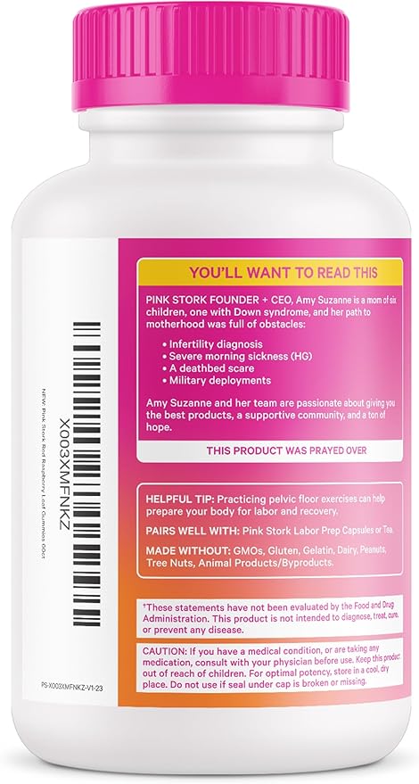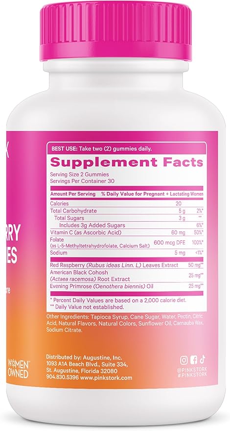 - Pregnancy Must Haves: Pink Stork Red Raspberry Leaf Gummies are the tastiest new addition to our labor line with clinically studied herbs Red Raspberry Leaf, Evening Primrose Oil, and American Black Cohosh -- plus methylated Folate and Vitamin C. You know our organic Red Raspberry Leaf tea for Labor Prep – our new gummies can do so much more!