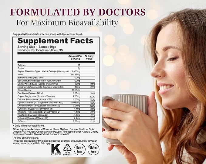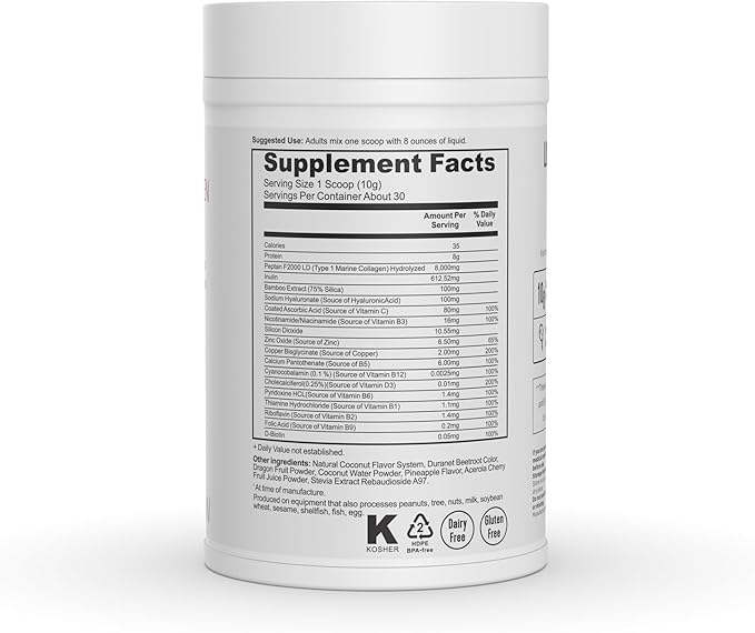 Marine Collagen Peptides - Dragon Fruit, Coconut Water, Pineapple - Vitamin C Hyaluronic Acid Copper Zinc Biotin Niacin D3 B-Complex - Hair Skin & Nails, 30 Servings