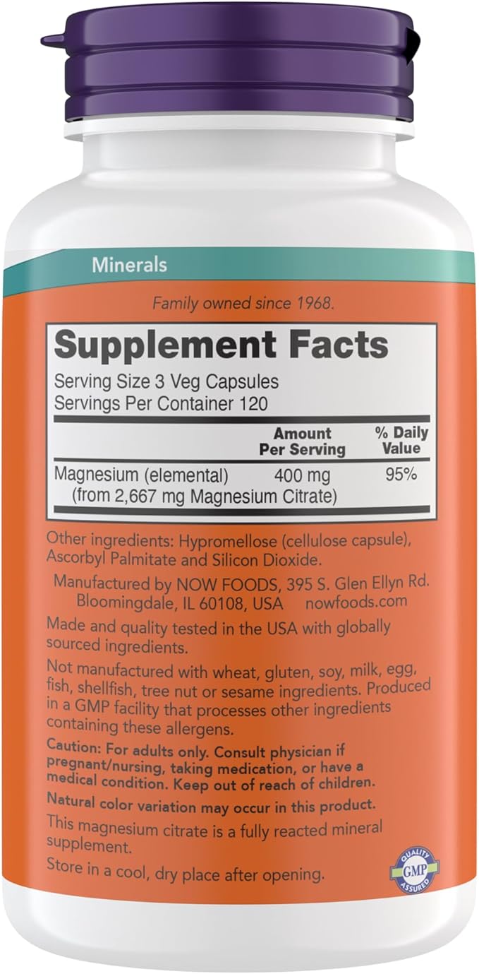 Now Supplements, Magnesium Citrate, Enzyme Function*, Nervous System Support*, Critical for Enzyme Function*, Gluten Free, Vegan, Kosher, Non-GMO 360 Vegetarian Capsules