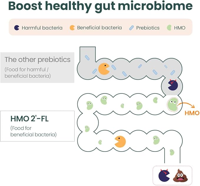 - 2'-FUCOSYLLACTOS (2'-FL): Derived from human milk oligosaccharides (HMOs), 2'-FL serves as a vital prebiotic that nourishes your gut microbiome. It's the essential nutrient found in mother's milk that promotes a robust gut and supports a healthy immune system.