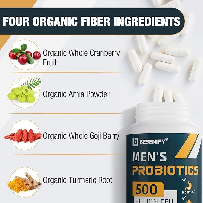 - Organic Fiber Ingredients: Innovative, unique, proprietary probiotics formula with adds organic whole Cranberry, Turmeric, Goji and Amla extract for special care for men's health. Which are known for their beneficial effects on men's health. So these men's probiotics can set you up for long-term wellness