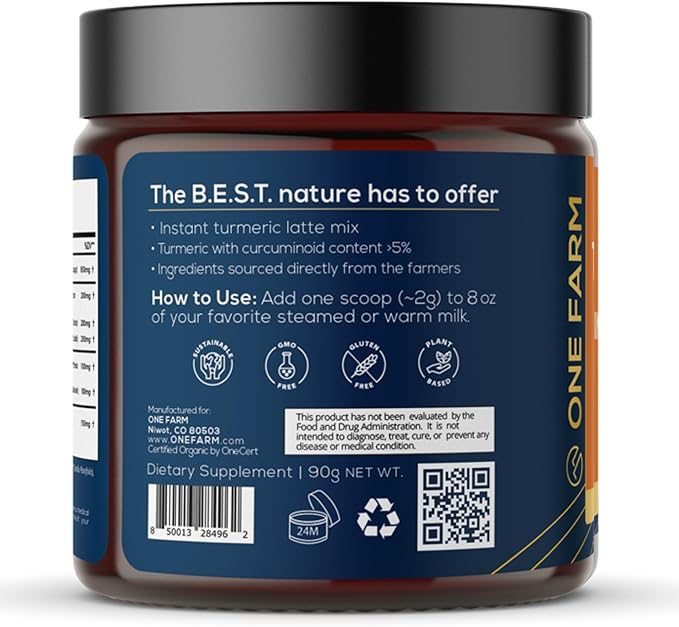 Turmeric Latte Powder - USDA Organic >5% Curcuminoid Turmeric, Lions Mane, Ashwagandha, Ginger, Cinnamon in a Resealable Glass Jar, 45 Servings - Perfect for Making Golden Milk