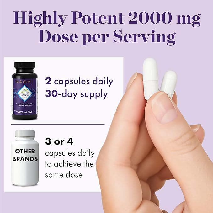 NAOMI Magnesium L-Threonate with 2,000mg Patented Magtein®, High Absorption Elemental Magnesium, Memory Supplement - Brain Health, Focus, Nerve Support, Heart Health, Natural Sleep Aid, 60 Veggie Caps