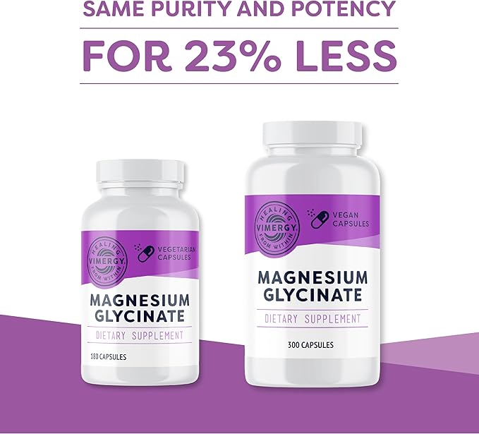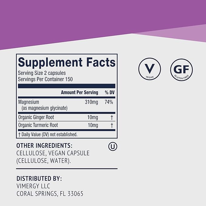 - PEACE OF MIND CLEAN. Vimergy Magnesium Glycinate comes in a clean, vegan capsule with no added gelling agents like carrageenan or unnecessary fillers and binders. Our product is also kosher, gluten-free, and paleo friendly. This full-size bottle contains 180 capsules. Vimergy Magnesium Glycinate is also available in a Value size bottle of 300 capsules and a trial size bottle of 90 capsules.