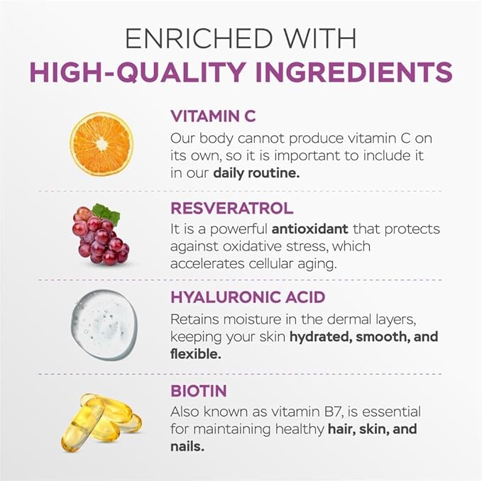 - Complete Blend: Features a potent blend of Collagen Peptides, Hyaluronic Acid, Vitamin C, Biotin, and Resveratrol for comprehensive support.