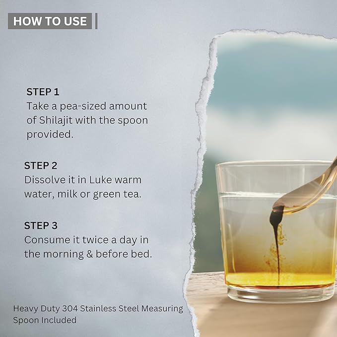 - PURE POTENCY WITH ENHANCED TASTE: Our pure Shilajit for women & men outmatches any capsule or powder; Unlike raw forms that taste very awful, we have enhanced the taste to make it easy to take. it's a treat for your senses & health; The creative measuring spoon ensures you get a precise dose of pure Himalayan best shilajit resin. Using the included spoon, take a pea-sized amount and stir it into water or milk until fully dissolved.